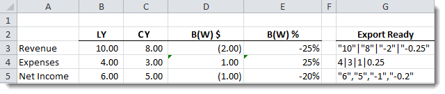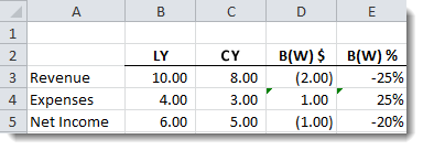 Below is an example of this function being used. The result of the custom function resides in column D and E. Revenue is lower in the current year, resulting in a negative variance. Expenses are also lower, but result in a positive variance.