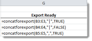 Function ConcatForExport(InRange As Range, Delimiter As String, UseQuotes As Boolean) As String